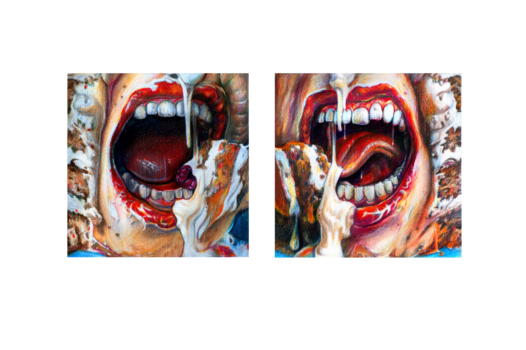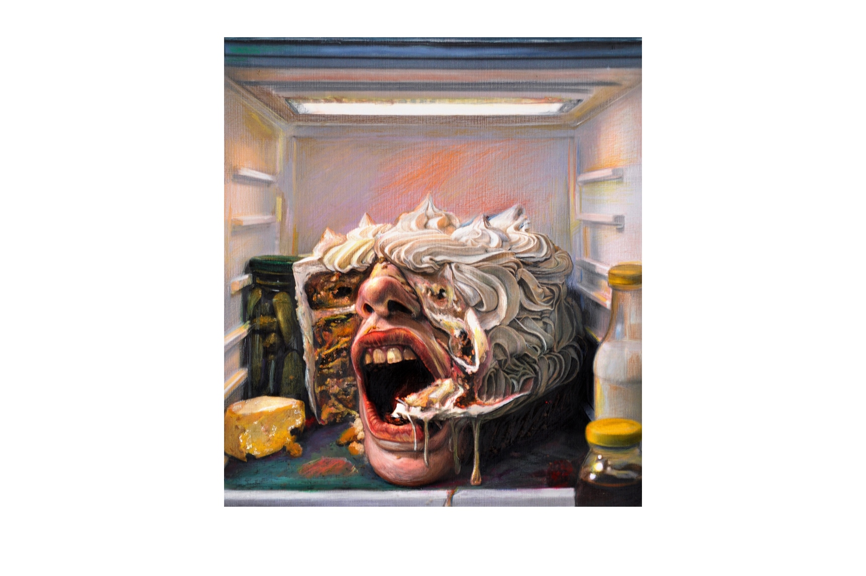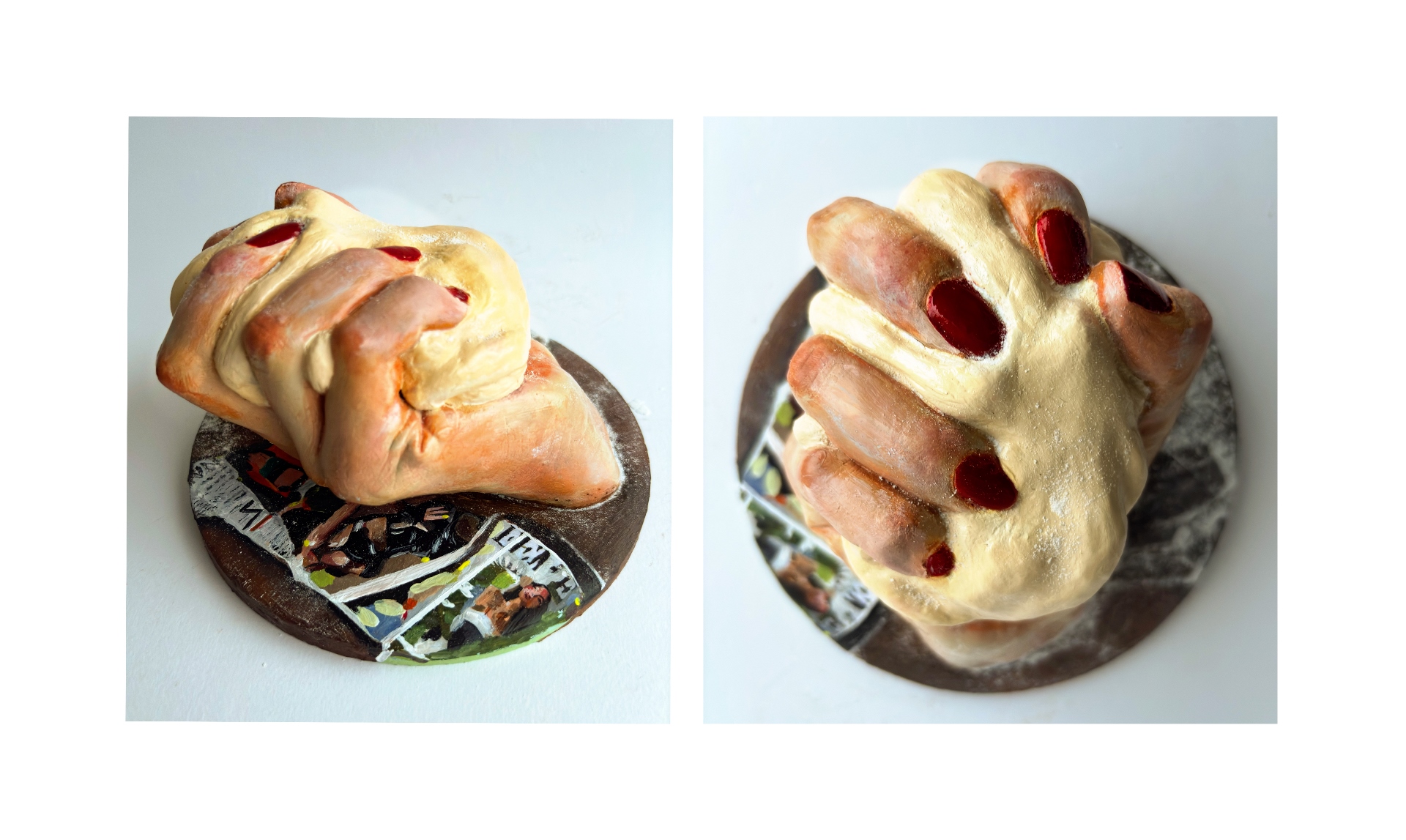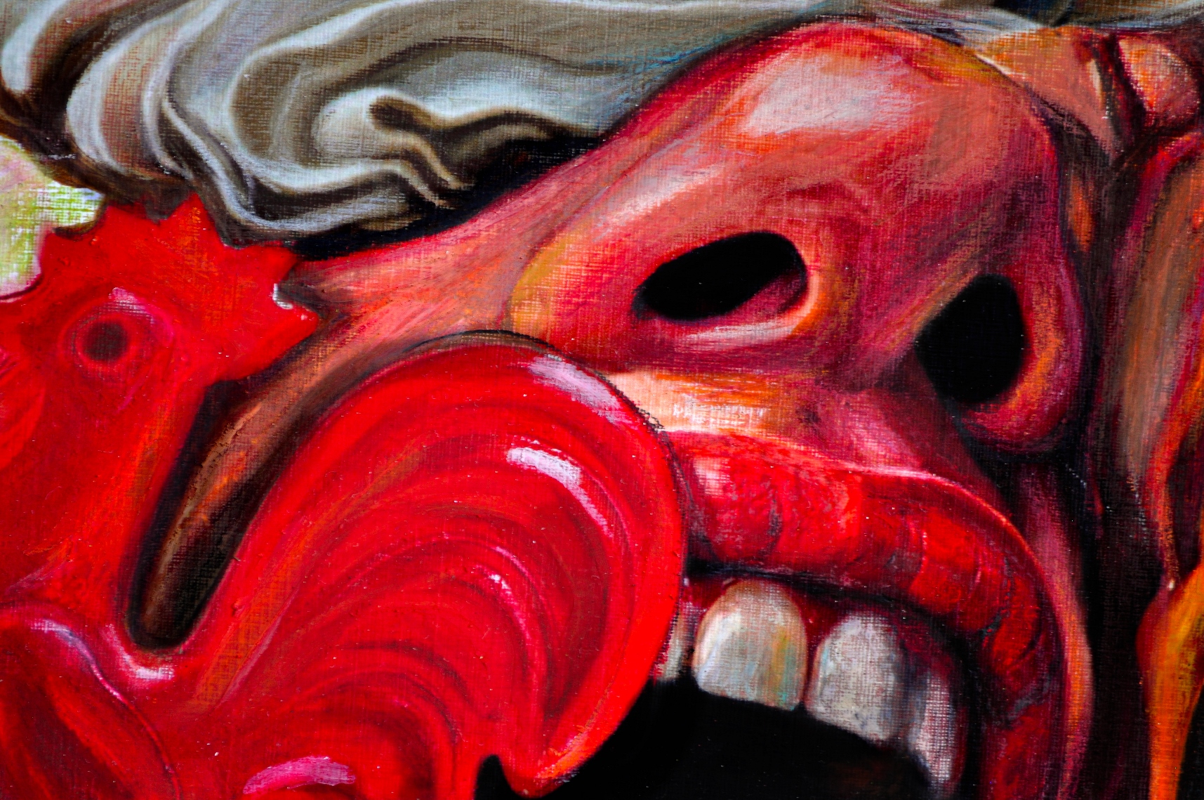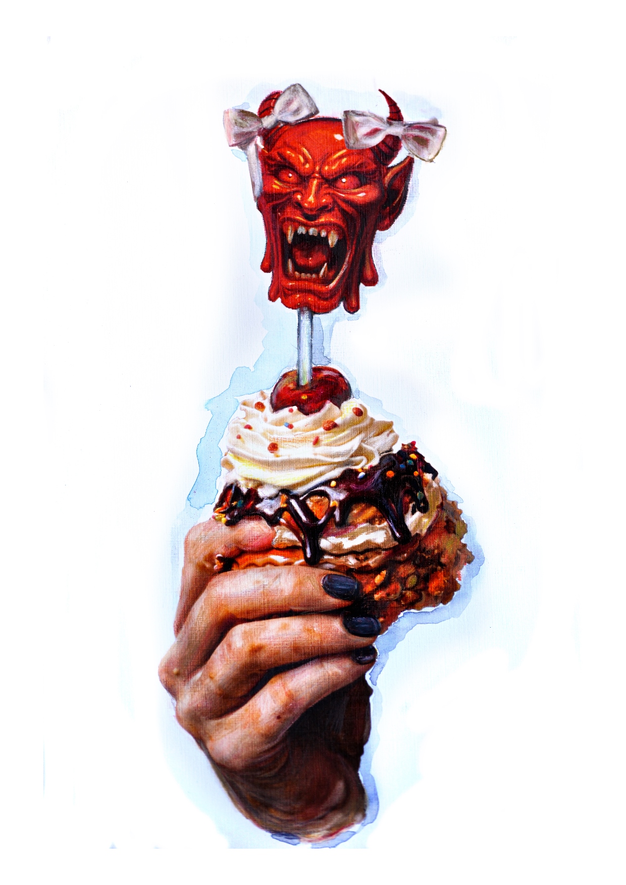 Oyster shell, acrylic on polyurethane, oil paint and epoxy on metal spoon