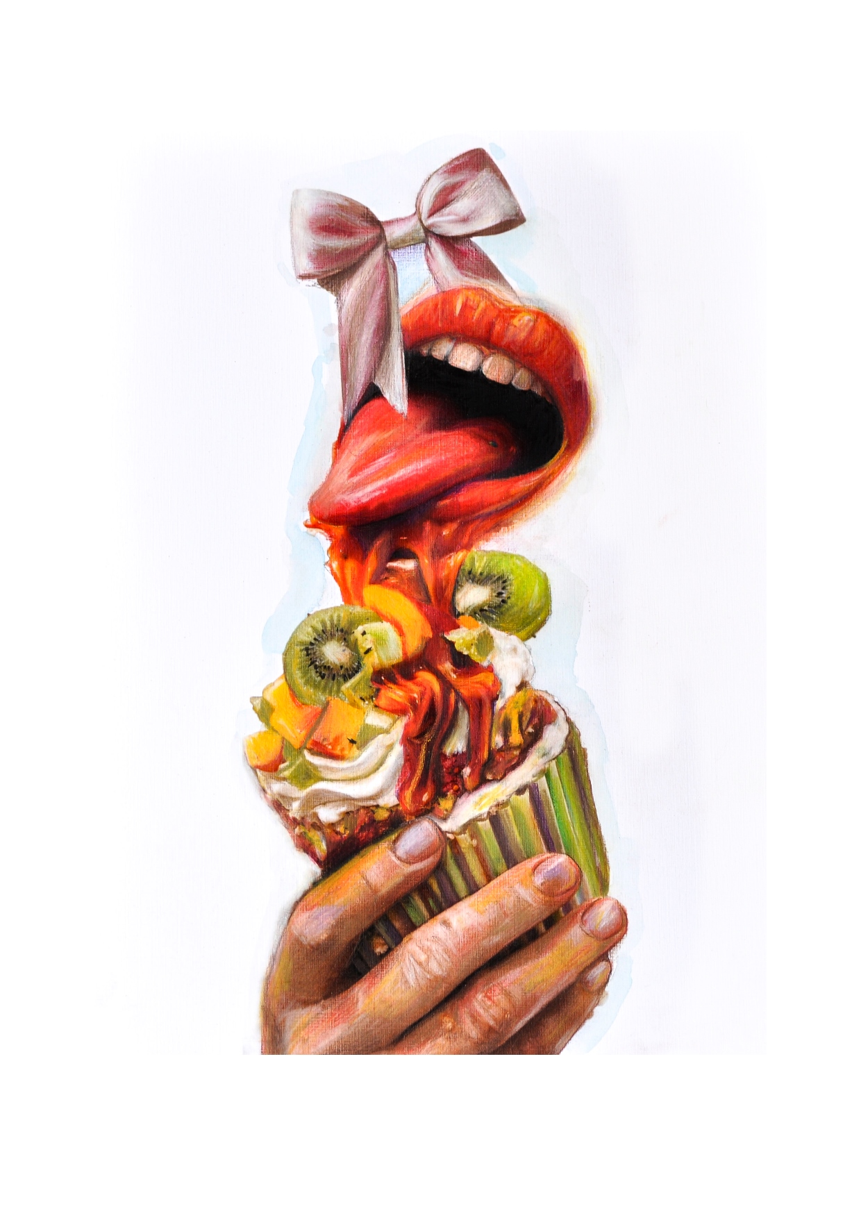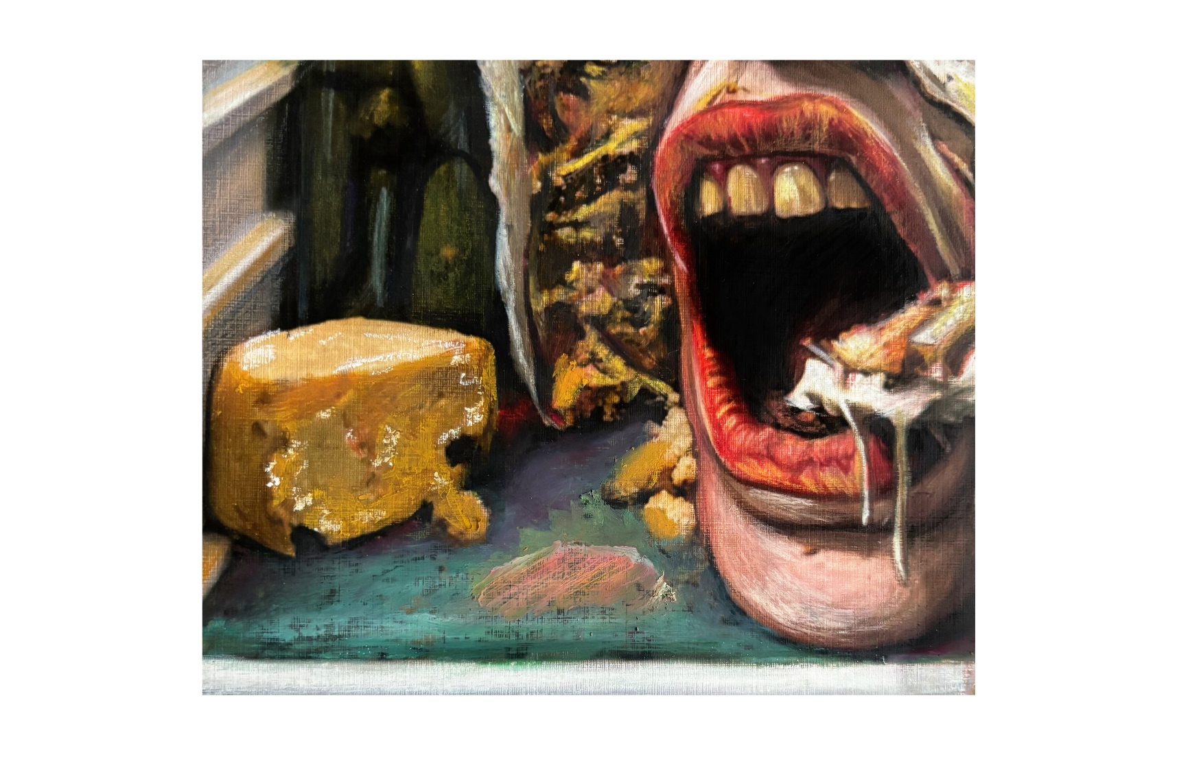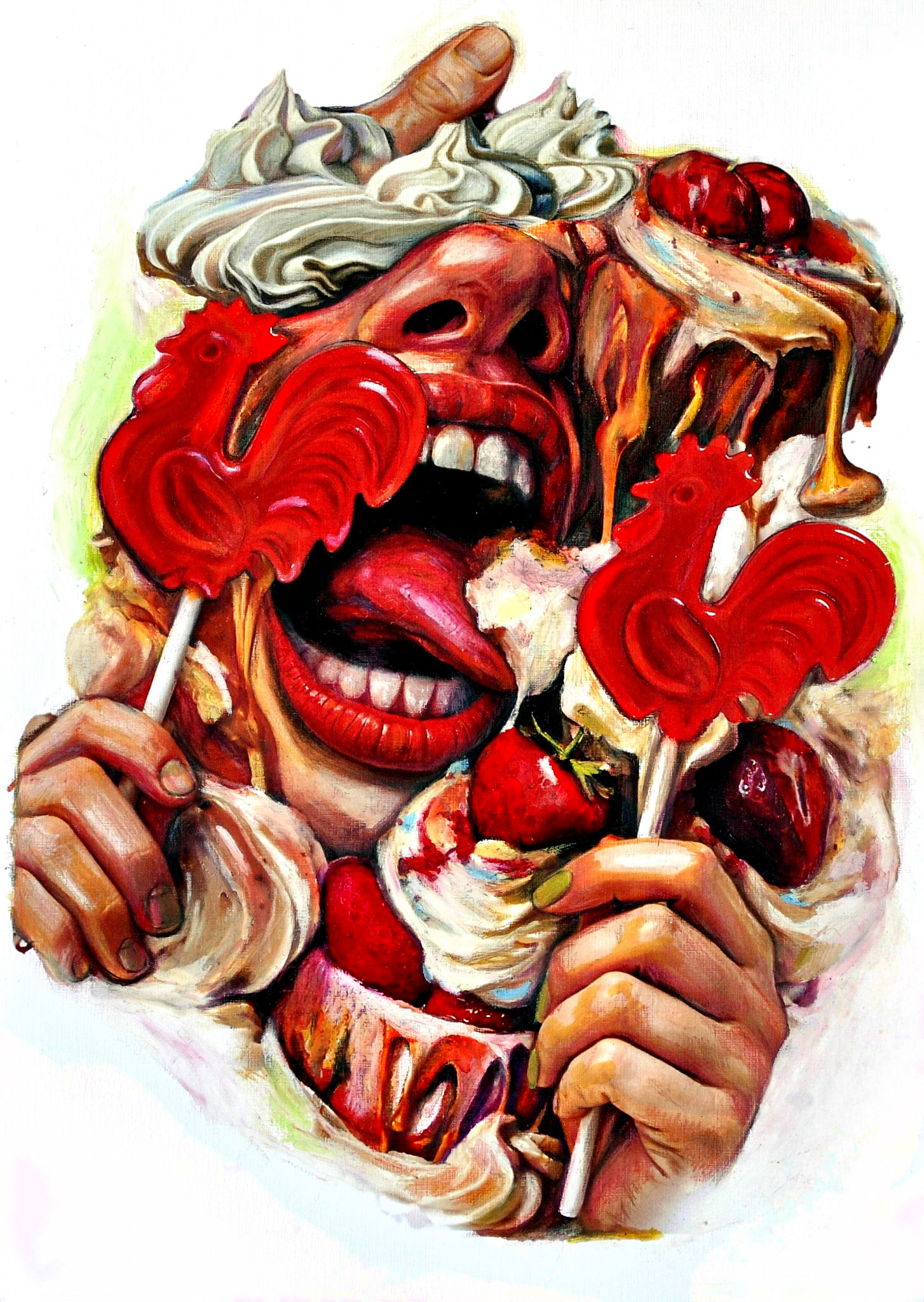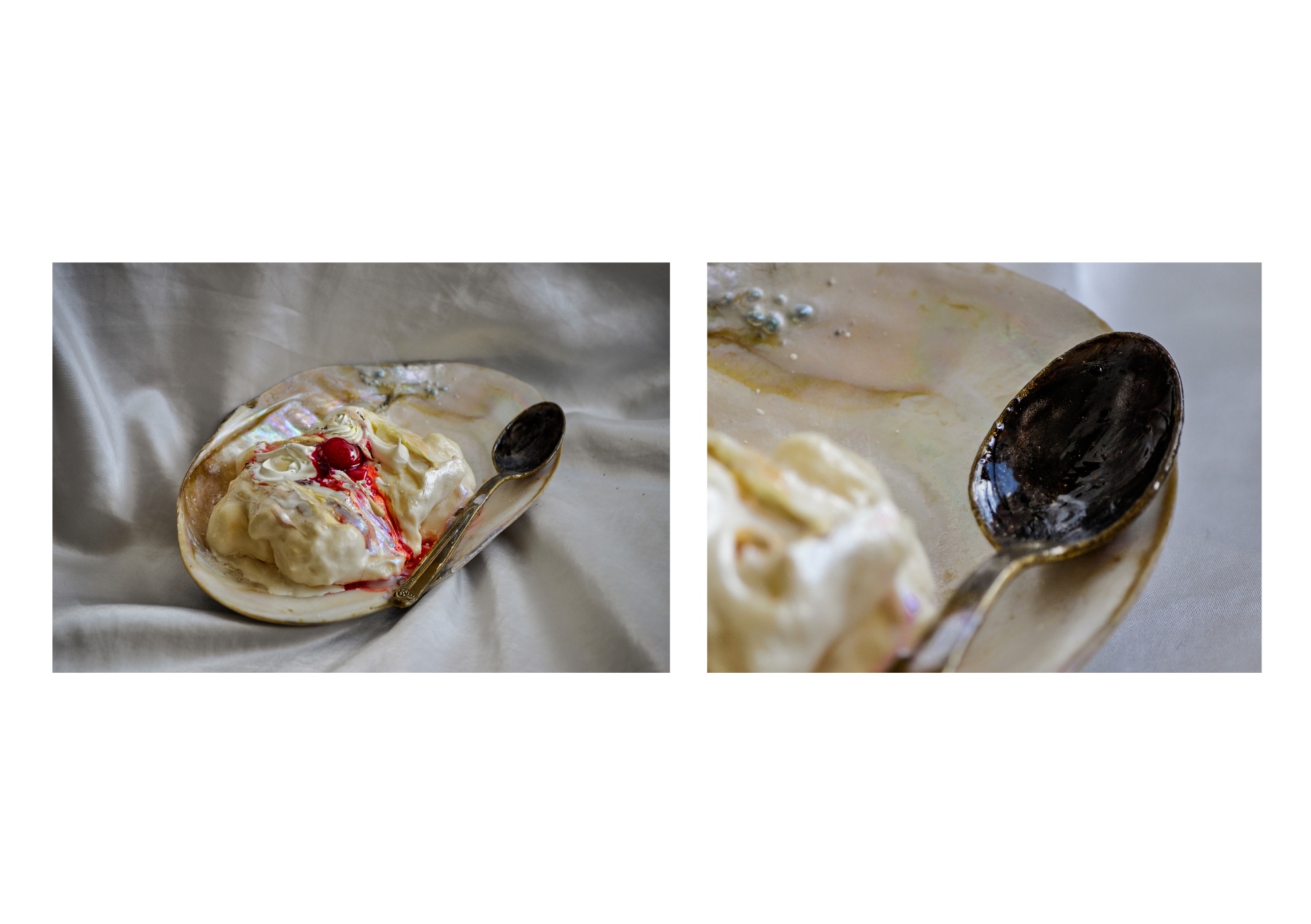 Oyster shell, acrylic on polyurethane, oil paint and epoxy on metal spoon